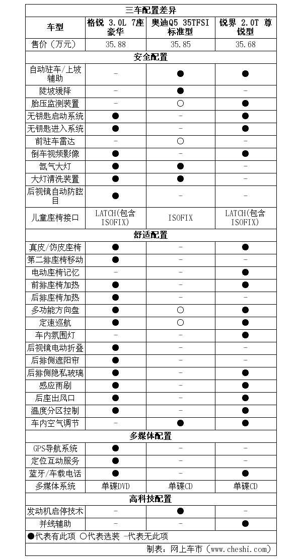 目前三车的官方知道价格相差不过2000元左右,我想对于购买35万级别的消费者来说这2000元几乎可以忽略不计了。格锐由于上市新车,自然在价格上没有什么优惠。而2013款Q5全系却有8000元的优惠,并且还有置换补贴。而锐界在询价的过程中却被告知进口车辆货源紧缺,需要加价3万元才能提车。,目前来说,价格这里Q5算三车中优惠最多的。