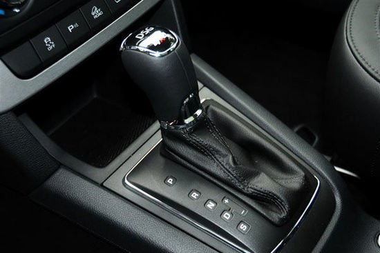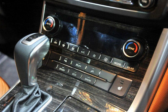 沉稳的四幅方向盘配有多功能按键,左侧是多媒体/蓝牙电话操作、右侧则是行车电脑操作。在方向盘中心下端还加装了一条银色镀铬装饰条,视觉效果还不错。值得一提的是,此次展出的车型还配备了换挡拨片功能。