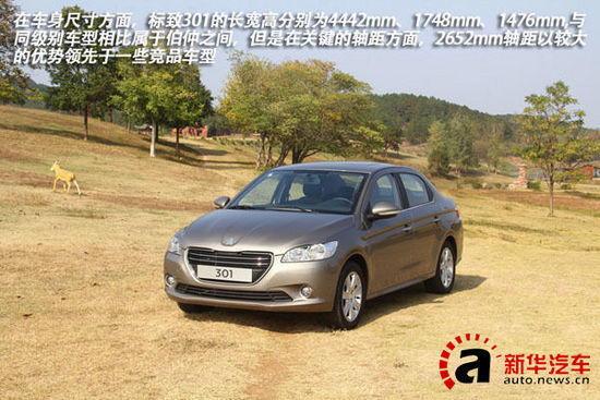 车身尺寸方面,标致301的长宽高分别为4442mm、1748mm、1476mm,与同级别车型相比属于伯仲之间,但是在关键的轴距方面,2652mm轴距以较大的优势领先于一些竞品车型,相信这样的轴距表现更能吸引那些人口较多家庭的青睐。