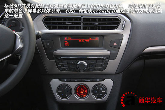 标致301并没有配备全新爱丽舍高配车型上的中央彩色大屏,而是采用了更简单的单色小屏幕多媒体系统,不过厂商也表示今后可以通过选装的方式来增加这一配置。