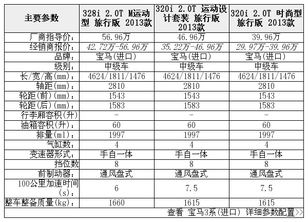 3系旅行车是目前在售旅行车中版本较多的,虽然我们都习惯的将沃尔沃V60称为旅行车,但官方却并不这样为其定义,所以除了V60之外,3系旅行车是进口旅行车中产品布局最缜密的。从入门级的320i到今天的主角顶级产品328i,三款细分车型跨越了30-50万区间,这也就让喜欢旅行车的朋友们有了更多的选择余地。