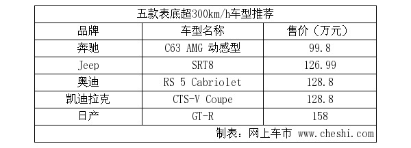 在如今的车坛300km/h早已不是划分超跑的界限,许多性能车都能超过这个速度。本次推荐的5款车型有四门性能轿车、两门Coupe、SUV以及超跑。作为经典的性能车奔驰C63四门版的入门价为99.8万元,绝对算的上是百万级的性能王者。RS5与CTS-V两款Coupe车型不仅动力强劲同时拥有出众的外形。如果你觉得SUV跑不快那么SRT8会颠覆你的想法。GT-R不必多说,性价比最高的超跑之一。