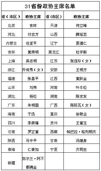 在今年年初的地方“两会”上,新换届产生了31位省级政协主席。据新华网记者统计,换届后,31位政协主席中有8人由省(区、市)委常委兼任,他们是:北京市委副书记、市政协主席吉林;天津市委副书记、市政协主席何立峰;广东省委副书记、省政协主席、省委政法委书记朱明国;辽宁省委副书记、省政协主席夏德仁;重庆市委常委、市政协主席徐敬业;福建省委常委、省政协主席张昌平;吉林省委常委、省政协主席黄燕明;新疆维吾尔自治区党委常委、自治区政协主席努尔兰 阿不都满金。其中,吉林、何立峰、夏德仁、朱明国,均为当地党委专职副书记。