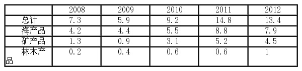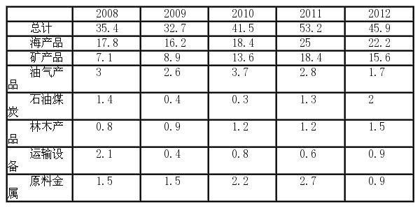 2008年-2012年阿州对华出口主要商品及金额(单位:亿美元)