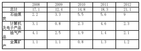 2008年-2012年阿州自华进口主要商品及金额(单位:亿美元)