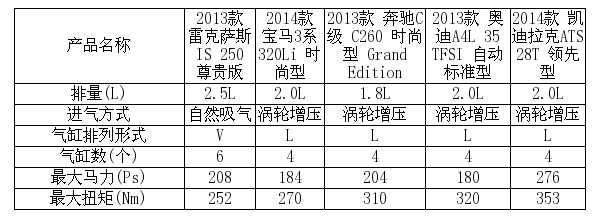 在提及雷克萨斯IS250动力前,我想让大家先看看同级别车型的动力配备水平,因此我挑选了同IS250同级的三款车型作为参考。他们分别是宝马3系、奥迪A4L、奔驰C和近日受关注度非常高的凯迪拉克ATS。