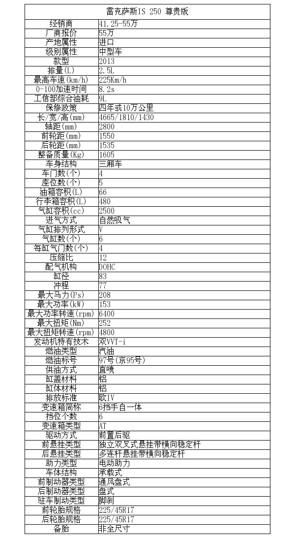 IS250配有2.5L V6自然吸气引擎,其最大功率为153kW,最大扭矩为252N.m。从对比表格不难发现,雷克萨斯IS250相比同级别对手在动力输出上略显逊色。