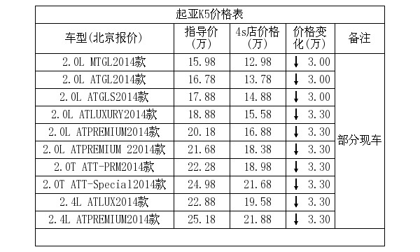 东风悦达起亚全新改款K5于2014年12月5日正式上市,新增了2.0T涡轮增压车型,宣布了起亚正式在中国市场进入“T”阵营。想当初,起亚K5的出现,彻底颠覆了韩系车固有的中庸、老气,将起亚这一品牌带上了年轻化道路。日前,网上车市从北京东风悦达起亚经销商处获悉,2014款起亚K5最高优惠3.3万元,部分现车销售。