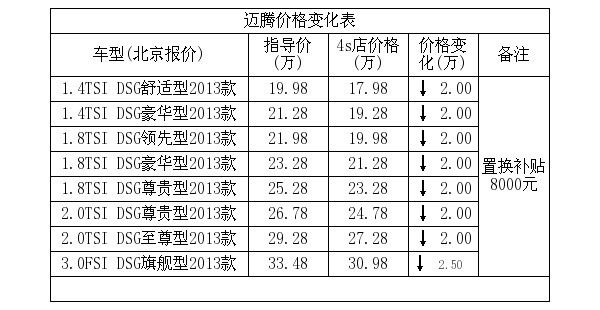 2012年3月14日,2012款迈腾正式上市,新车在原有车型基础上,增加了两款年型车型,分别为2.0TSI+DSG豪华型和1.8TSI+DSG领先型,共计9款车型,售价区间为19.98万-33.48万元。日前,网上车市从北京一汽-大众4S店获悉,迈腾置换购车目前最高综合优惠3.3万元,部分现车销售。