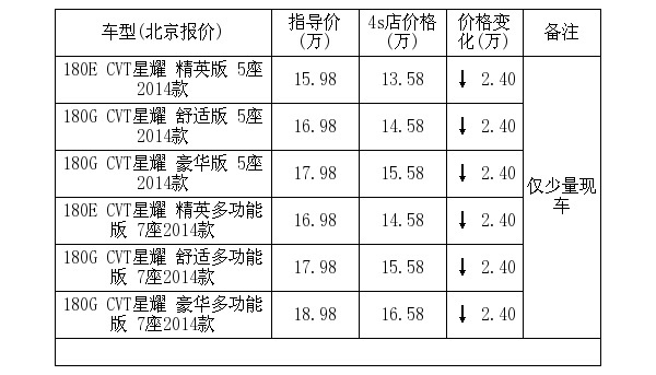 据店内销售人员介绍,目前店内逸致仅有少量现车。售价方面,近期购车部分车型最高可享受2.4万元的车价优惠,其中,2014款 星耀 180E CVT精英版会后仅售13.58万元,与之前相比优惠幅度略有增加。感兴趣的朋友,不妨致电经销商咨询详情。