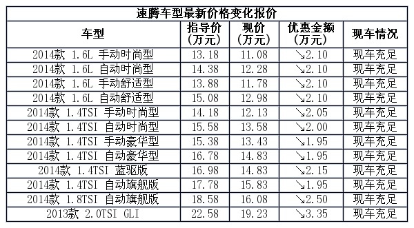近日,编辑走访北京海联力通经贸有限公司了解到,目前商家店内速腾现车销售,颜色较全,购车最高可优惠3.35万元现金,同时赠送2.38万礼包,礼包含:车辆年审卡、轮胎养护卡、底盘护甲及工时卡等。另外商家将于3月23日举办大型看车团活动,活动当天商家会给出更加优惠的价格,报名请点击:【京】十周年店庆一汽-大众全系车型惊爆价看车团活动火热招募中 。详情请见下表: