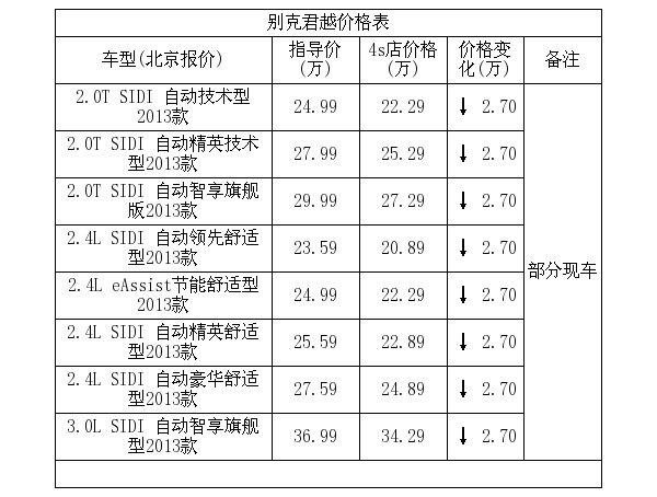 2013年6月21日,继3.0L智享旗舰型率先上市之后,新君越2.0T和2.4L车型也终于出现在消费者面前。相较老款车型,新君越官方指导价有所降低,但配置却提升了不少,使其性价比优势得到了显著地提升。近日,网上车市从上海通用别克北京经销商处获悉,新款君越有部分现车销售,现金优惠2.7万元。