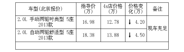 2013年3月4日,北京现代正式推出2013款途胜。此次上市的新途胜在外观、内饰与配置方面均做出了升级调整,动力上则依旧搭载老款的2.0L发动机,并分别匹配了5速手动或4速手自一体变速箱。近日,笔者从北京现代鸿都智通4S店了解到,2013款途胜最高直降4.5万元,有部分现车。具体如下: