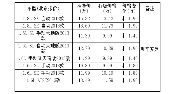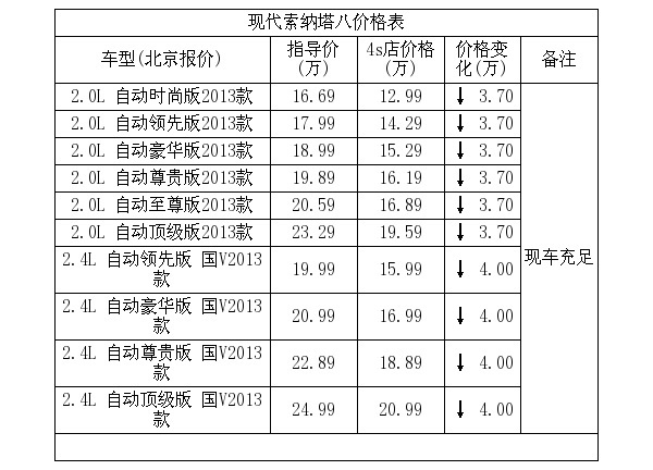 2013年4月12日,2013款现代第八代索纳塔与现代新款途胜同时上市,新款索纳塔八代在外观方面进行了小幅度的调整。近日,网上车市网站从北京现代北京经销商处获悉,第八代索纳塔全系最高优惠4万元,现车充足。
