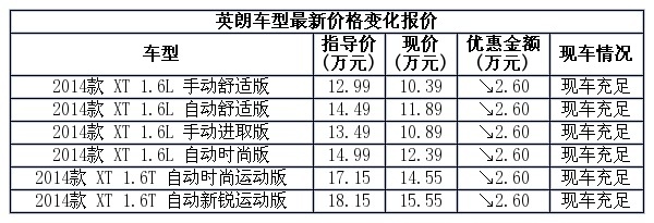 近日,编辑走访北京联通昊普汽车销售服务有限公司了解到,目前商家店内2014款英朗现金优惠2.6万元,现车充足。对此车感兴趣的网友不妨致电经销商或到店咨询。详情见下表: