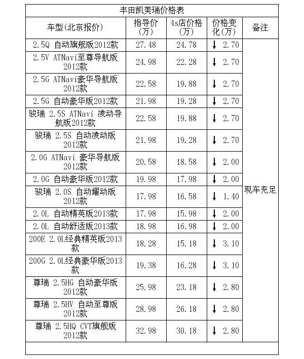 2013年3月13日,广汽丰田2013款凯美瑞增值版正式在国内上市,此次上市共推出三款车型,分别为2.0E精英型、2.0G舒适型、2.5G舒适型,售价区间为17.98-20.98万。日前,网上车市从北京广汽丰田经销商处获悉,目前2013款凯美瑞现车充足,最高优惠3.1万元。