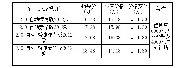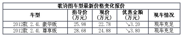 近日,编辑从北京了解到,店内歌诗图2.4L现车充足,购车最高优惠3.8万元现金,置换享补贴,感兴趣的朋友可到店咨询,详情见下表:
