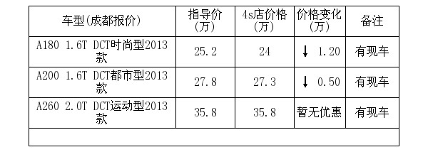 据奔驰4S店销售人员表示:2013款奔驰A级系列车型,最高综合优惠1.9万元。目前店内有少量现车,颜色可选。具体价格信息见下表: