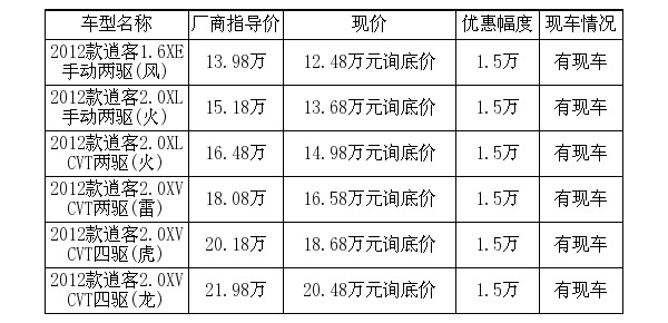 近日,编辑从东风日产了解到,2012款逍客购车直降1.5万元,车源方面,商家表示,逍客目前现车有售,到店可试驾,感兴趣的朋友不妨关注一下。详情请见下表: