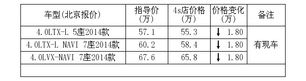 在去年的广州车展上,一汽丰田2014款普拉多在国内消费者面前正式亮相。相较老款车型,新车主要是对前脸进行了一系列的升级,视觉效果上显得更加凶猛,同时中控台的按键布局也有所改变。近日,笔者从一汽丰田北京东仁天宇4S店了解到,2014款普拉多有部分现车,现金优惠1.8万元。具体如下: