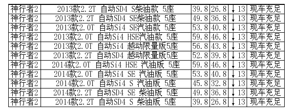 近日,北京神行者2最高优惠13万元,现车充足,感兴趣的朋友可到店或致电咨询,详情见下表: