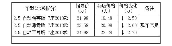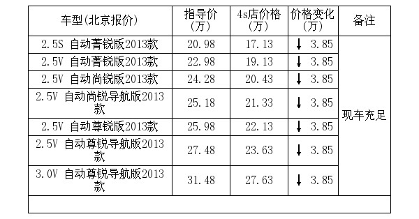 2013年9月,一汽丰田正式推出2013款锐志。此次上市的新锐志分为2.5L与3.0L两个排量共7款车型,售价区间为20.98-31.48万元。与老款车型相比,新锐志在外观方面有了明显改变,呈现出更激进更运动的整体风格。近日,笔者从一汽丰田北京运通博裕4S店了解到,2013款锐志现车充足,综合优惠3.85万元。具体如下: