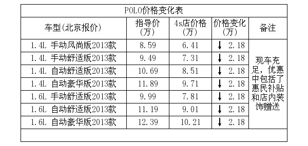 据4S店销售介绍,目前POLO全系现车充足,购2013款POLO可享受全系2.18万元的综合优惠,这个降价中包含了惠民补贴和店内的装饰赠送,消费者请注意。