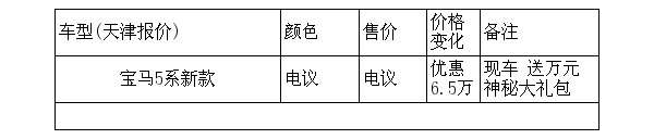 近日,在北京了解到,宝马5系新款现车到店,现车颜色齐全优惠6.5万,购车就送万元神秘大礼包,机会难得欲购从速。