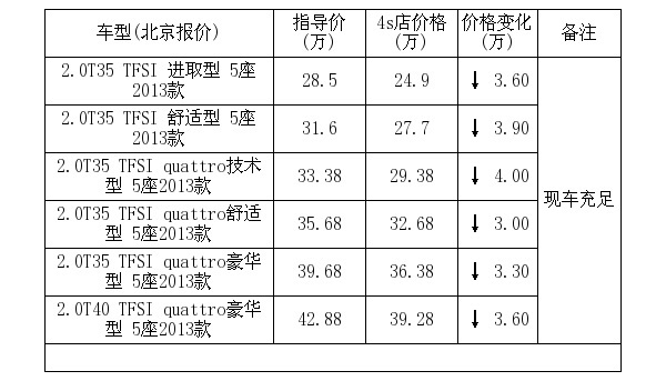 奥迪Q3是奥迪Q系列中的最新成员,基于大众最热门的PQ35平台打造而来,定位在Q7、Q5之下。而国产版Q3已于2012年4月8日正式上市销售,目前,奥迪Q3拥有2.0T一种排量2种功率版本,共6款车型可供消费者选择,售价区间为28.50-42.88万元之间。近日,编辑从北京4S店处了解到,国产奥迪Q3最高降4万元,现车充足。具体如下:
