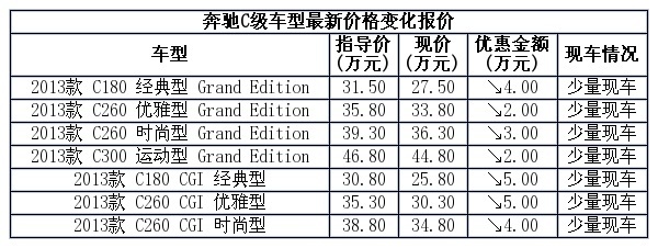 近日,编辑从广州了解到,奔驰C级最高现金优惠5万元,少量现车,有兴趣的朋友不妨致电经销商详询。具体车型信息如下: