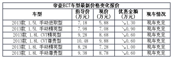 近日,编辑了解到,目前帝豪EC7最高优惠1.3万元,店内现车充足,感兴趣的朋友不妨到店详询。该车型详细信息请见下表: