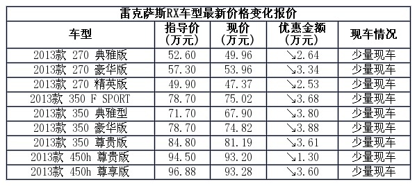 近日,编辑走访深圳雷克萨斯4S店,从店内相关人员处获悉,店内雷克萨斯RX有少量现车,现在到店购车可享受最高3.88万元现金优惠。详情请见下表: