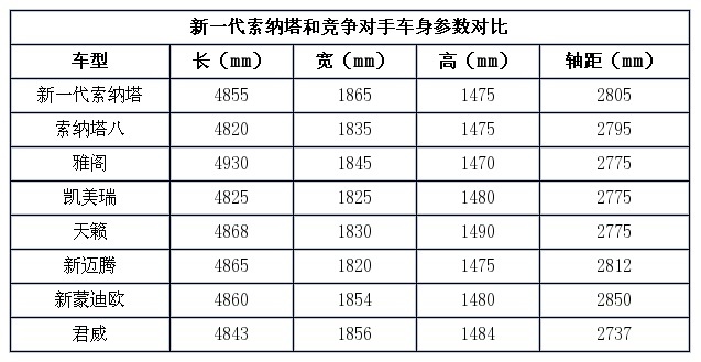 新一代索纳塔的长宽高分别为4855mm*1865mm*1475mm,相比老款车型更长、更宽。新车的轴距为2805mm,相比老款车型增加10mm。此外官方表示新一代索纳塔的前排座椅靠背要更薄一些,将为后排乘客提供更好的腿部空间,这一点我们也期待未来真实的体验。