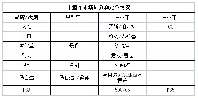 每一个车型级别市场其实都是能够细分的,例如在紧凑型车市场,我们可以看到紧凑型-、紧凑型以及紧凑型+三个细分级别,成熟的车企会在这三个市场都布局下产品。经典的布局就是一汽-大众的捷达、宝来和速腾,中型车市场其实也是如此。马自达6、帕萨特、CC都是销量不错的产品,但从价格和定位来看,他们其实分别定位在中型车-、中型车以及中型车+三个细分级别。