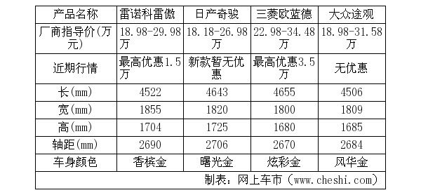 点评:科雷傲作为雷诺品牌在华的支柱车型,以纯进口,高配置,四驱功能强大的特点赢得了相当一部分消费者的青睐,但受到众多合资品牌国产SUV的冲击和自身进口车税费较高等因素影响,最终结果只能是叫好不叫座,好在2014款科雷傲趁着改款的机会加入了2.0排量车型,进一步降低了门槛。随着日产新一代奇骏即将上市销售,相信这将是这一代车型的最后一次改款。