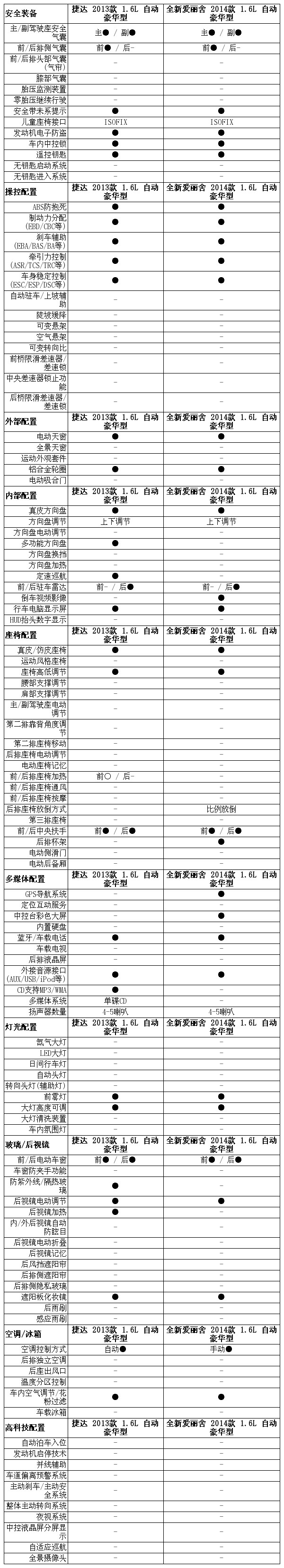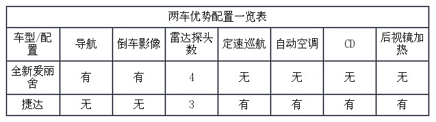 在倒车辅助上,捷达配备三点探头,全新爱丽舍配备的是四点探头+倒车影像的搭配,大幅领先捷达并达到了同级别比较高端的水平。这里多说一句,捷达只有高配的豪华型才会装配倒车雷达,让人觉得很不大气,并且低于同级别的水平,而全新爱丽舍中间配置的舒适型以及高配的豪华型均配有倒车雷达,舒适型也可选装倒车影像,比捷达厚道一些。从普及性上看,能够达到同级别的平均水平,从功能性上看,拥有倒车影像的它则高过平均线了,给好评。