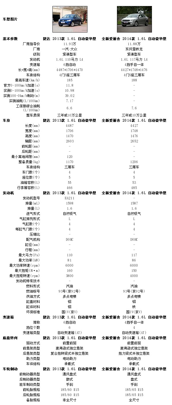 同样的1.6L发动机,捷达为全铝材质,全新爱丽舍为铝制缸盖、铸铁缸体,最大功率全新爱丽舍高一点,扭矩则是捷达高一点。两车在变速箱的匹配上有很大差别,捷达配备了6速自动变速箱,带运动模式,但不带手动模式;全新爱丽舍配备了4速手自一体变速箱,并带有运动模式和雪地模式。顺便提一句,捷达也比全新爱丽舍轻了36kg,这同样会对动力性能和油耗产生影响。