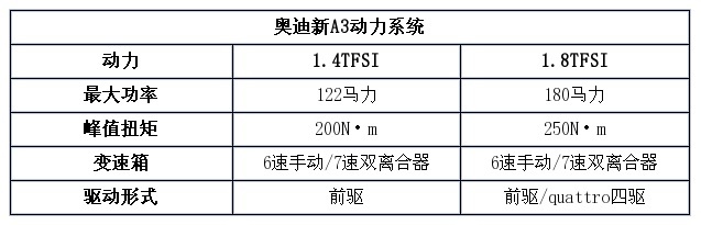 动力方面,奥迪新A3配备了两款汽油发动机,其中一款是1.4升TFSI发动机(单涡轮增压),最大输出功率为122马力,峰值扭矩200N·m,另一款是1.8升TFSI发动机,最大输出功率为180马力,峰值扭矩250N·m。传动系统方面,与发动机匹配的6速手动变速箱或7速S-tronic双离合变速箱。有消息称,先期进口到国内的A3只提供搭载1.8TFSI发动机的40TFSI车型,至于1.4TFSI发动机可能会留给国产版本使用。