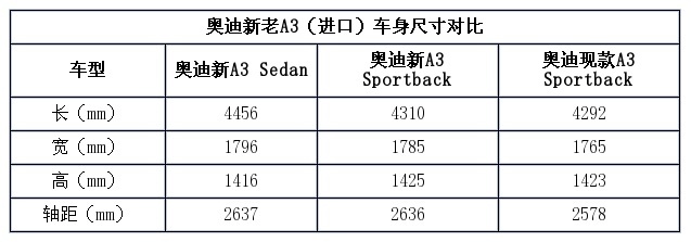 在车身尺寸方面,新A3五门两厢(Sportback)相比老款车型轴距增长58mm,五门三厢的新A3还要比两厢再长1mm,这些改变均是为车内空间“服务”。至于国产车型尺寸是否还会有变化,目前暂时还没有准确的消息。