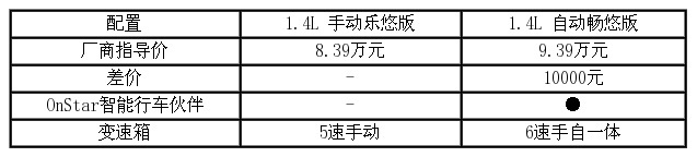 畅悠版和乐悠版的区别是前者采用了自动变速箱和配备了安吉星系统,费用上增加了1万元。除了变速箱和安吉星以外,其它配置与手动乐悠版完全一样。
