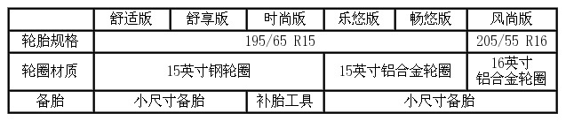 新爱唯欧1.4L车型的轮胎规格全部为195/65 R15,其中舒适版、舒享版和时尚版都采用了钢轮圈,乐悠版和畅悠版则使用了铝合金轮圈。1.6L车型采用的是16英寸铝合金轮圈,轮胎也升级为205/55 R16。除了轮胎规格和轮圈不同之外,时尚版车型没有备胎,改用补胎工具,其它车型则全部为小尺寸备胎。只有中配车型没有采用备胎而是用补胎工具,这样的配置表现有些让人难以理解了。