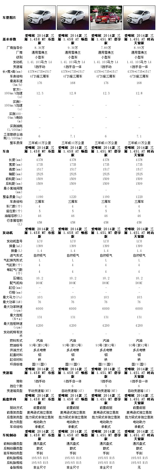 [汽车之家购车手册] 2014年6月6日,中期改款的雪佛兰爱唯欧正式上市了,这一次改款之后的爱唯欧在售价方面较之前的车型有了一定幅度的降低,售价从7.39万元到10.99万元,根据配置的不同三厢版有七款车型,两厢版有六款车型。