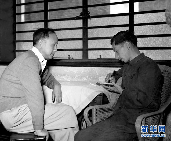 1955年,冲破重重阻力回到祖国的著名科学家钱学森(左)在接受新华社记者采访(资料照片)。