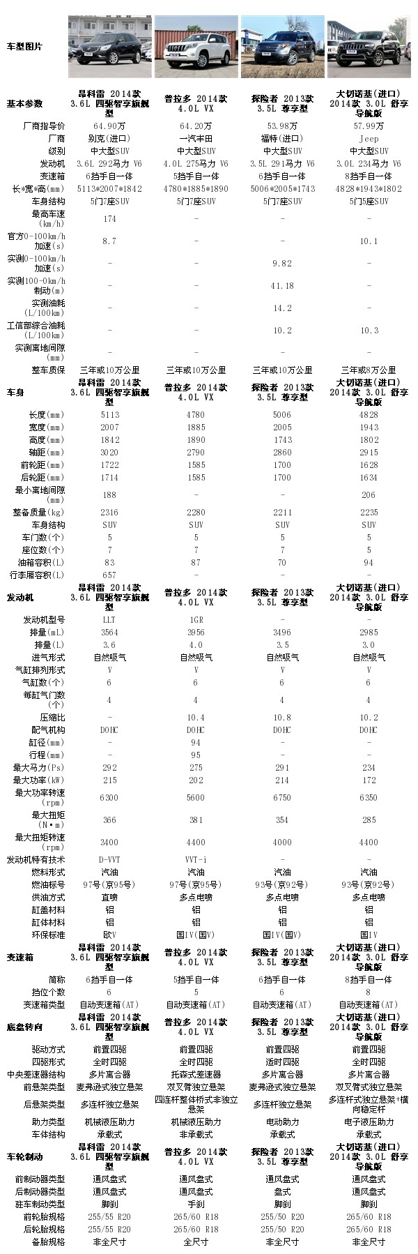 这篇推荐的四款中大型SUV车型各有各的性格特点,昂科雷偏向于城市舒适性,也可以进行商务活动,基本上没有什么越野能力;探险者外观上更加粗犷一些,并且四驱系统带有一定的脱困能力,可以进一些低强度的越野活动;而普拉多与大切诺基则拥有更强大的越野能力与四驱系统,可以到野外撒欢,城市中驾驶也不乏舒适性,但整体车系价格要稍贵一些。目前,四款车型在各地区都有不同幅度的优惠,喜欢的朋友可以去4S店试驾比较一番,再根据自己的实际用途来选购。(文/图汽车之家张郁达)
