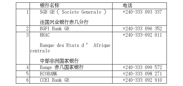 赤道几内亚当地支付方式以现金和支票为主,无法使用信用卡。兴业银行和CCEI银行有为数不多的ATM现金提取服务。金融环境相对稳定,但银行及金融服务较落后。主要商业银行包括赤几国家银行(National Bank of Equatorial Guinea, BANGE)、法国投资的赤几兴业银行(Societe General de Banques en Guinea Equatoriales, SGBGE)、喀麦隆投资的CCEI Bank和加蓬投资的 BGFI Bank。 赤几实行外汇管制,不实行外汇配给。在当地银行提取美元现金有限制,且收费较高。