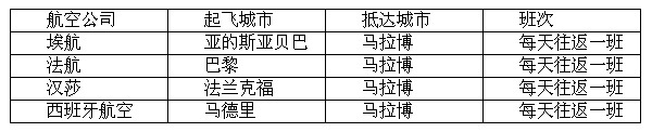 说明:1、 目前国航尚未开通北京至埃塞俄比亚首都亚的斯亚贝巴的直航,走北京-亚的斯亚贝巴-马拉博航线只能乘坐埃航。