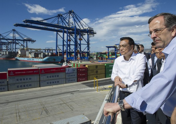 (6月20日,克强总理与希腊总理萨马拉斯共同考察中国远洋运输集团比雷埃夫斯集装箱码头,摄影记者:王晔 )