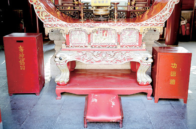 ▲在北京潭柘寺一处大殿内,并排摆放着两个不同的功德箱。寺内僧人称,有“广种福田”字样的是僧团的,而另外一个是景区设立的(11月28日摄)。