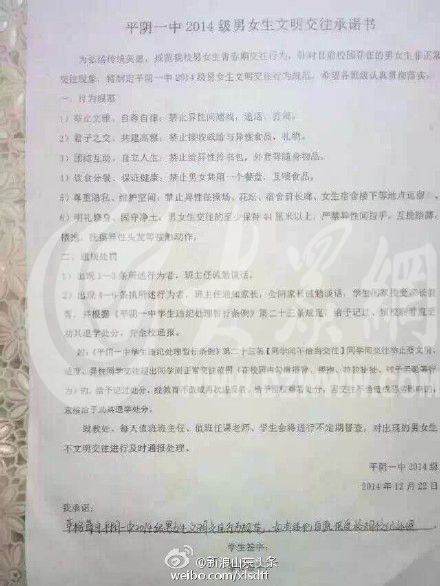 日前,一纸《济南平阴一中2014级男女生文明交往承诺书》在网上流传开来。承诺书严禁异性间的亲密举动,甚至男女之间的距离也严格规定在44厘米以上。细则规定,违反者最重将被处以劝退处罚。该校政教处主任回应称,此事出发点是好的,但是内容有一些不妥,学校已经要求年级主任出面解释并对承诺书内容作修改。