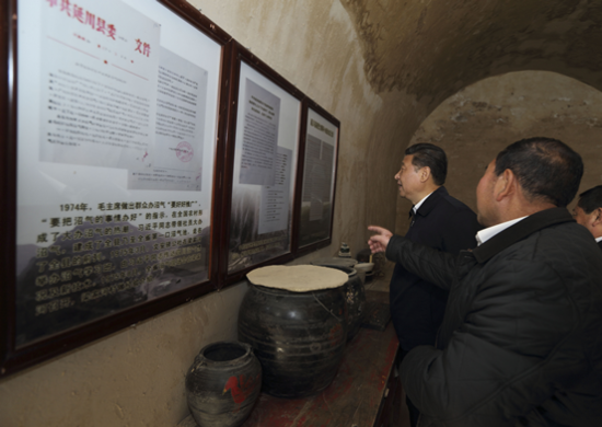 在村委会,习近平一边听取村干部介绍,一边驻足观看展板,不时询问近年来村民增收、林果种植、养殖业发展、水土保持、基础设施建设等方面的情况。